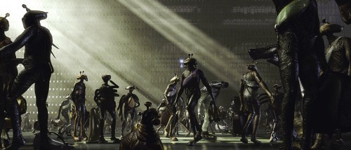 Wanting Men in Black II to end with a ‘punch’ — just like the first film — Sonnenfeld settled on the idea that our world is contained within a locker inside a giant alien station. This final scene — an entirely digital sequence barring the bluescreen elements of the actors — showcases a multitude of alien creatures, and was assigned to Rhythms & Hues. Bill Westenhofer’s team populated it with over 120 aliens, which were multiple copies of four designs. Those, conceived by Nick Pugh, were selected by Sonnenfeld and then translated in three dimensions. Westenhofer explained: “out of 40 designs, Barry chose four. We modeled those and added some random variations in the sizes and colours so they wouldn’t all look the ame.” Animators developed procedural walk cycles, and additional actions were hand-animated.