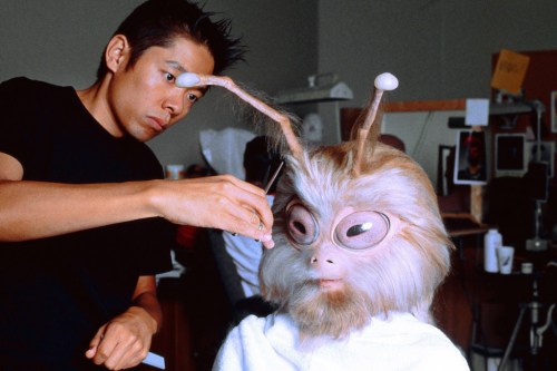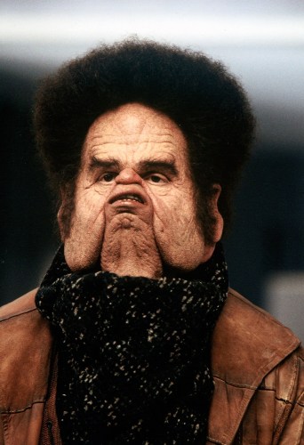 Of all the thugs, the most challenging was ‘Flesh Balls’ — named ‘Ballchinian’ by Will Smith in one of the takes for the scene, which was ultimately kept. “The issue was how far to go with that,” said Sturgeon. “Rick’s idea was to put him in some type of high collar, so we wouldn’t actually see the joke until the lower half of his face was revealed.” The make-up appliance was driven by servos; the make-up, based on Baker’s design, was devised by Kazuhiro Tsuji. “The character’s mouth is up high and very small,” he said. “it’s really out of proportion. So we made little teeth inside a little mouth, and mechanized the mouth with three servos. Even the balls on the alien’s chin had servos, so they could swing back and forth as he spoke.” The false mouth and chin were attached to the actor’s face via screws on either side of the mouth, hidden by a deep wrinkle in the alien face.