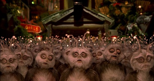 Ten puppets were built for the apartment scene and filmed in an elevated set under the supervision of puppeteering supervisor Tony Urbano. They were puppeteered by radio control, rods and cables. Sturgeon explained: “usually, one puppeteer had a joystick that controlled the neck and a little pistol-grip for the mouth; then there was a person producing the gross body movement with a stick that came down through the torso. Sometimes, just before the shot, Barry would say, ‘I want the hand to do this,’ so they’d attach monofilament to a hand or wrist to get that action. It was all done on the fly.”