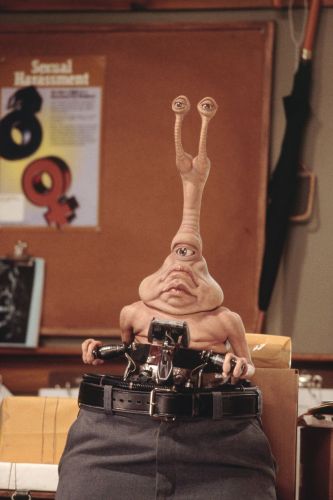 The ‘sorting alien’ — played by Jeremy Howard — combined practical elements with digital extensions provided by Tippett Studio. Visual effects supervisor Scott Souter explained: “this alien is in a cubicle office, smoking and drinking coffee and sorting mail, all at the same time.” Make-up on Howard — designed at ILM — was devised by Kazuhiro Tsuji; it included full head make-up and bluescreen arms, so that they could be replaced in post-production with the digital alien arms. “They had three fingers and a thumb,” said Souter, “skinny arms with bulbous joints.”