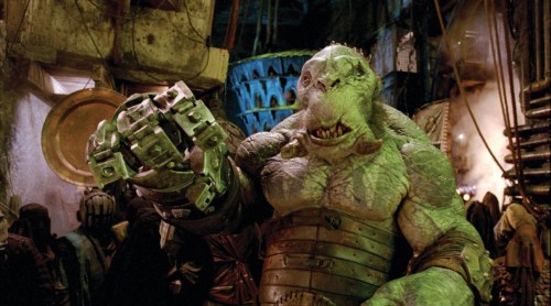 A completely digital Wink was provided for shots in the Troll market where the actor couldn’t safely perform the stunt or action required. Digital effects supervisor Justin Martin added: “it’s predominantly practical, but there are a lot of digital additions — from something as simple as adding digital eye-blinks, to replacing part of a main character (like the mouth and jaw, or a mechanical fist) to putting full digital characters.” Mike Wassel, part of the digital crew, also said: “in one particular close-up, we replaced the muzzle, leaving the eyes and the rest of the head intact. We animated the tongue and gave the mouth additional articulation.” Wassel also commented: “one particular shot called for Wink to rise up behind Hellboy. It sounds so simple — but it would have been physically impossible for Brian to perform that action in the suit.” The digital Wink also featured early on in the film, conversing with Nuada. Originally a practical shot, it was replaced with a CG version to delay a full reveal of the character. The scene of the character’s demise also employed the digital Wink.