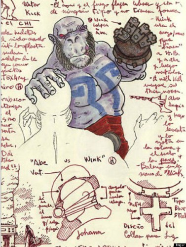 The preliminary drawing and idea for the character may have been influenced by Unmensch and Brutus, two characters from Mike Mignola’s Hellboy comics; Wink inherited the ape-like qualities and mechanical forearms from Brutus, and the launching chain-fist from Unmensch. Wink’s name, on the other hand, was based on that of a one-eyed dog owned by Selma Blair at the time of production.