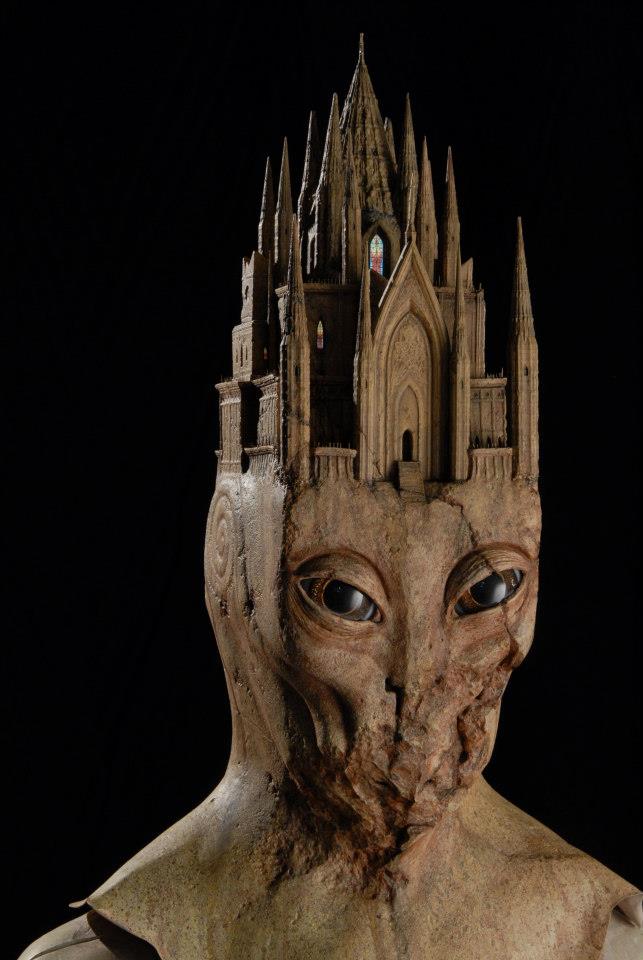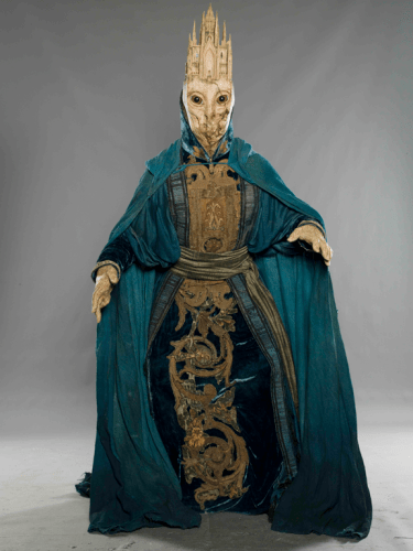 Entering a map shop, Princess Nuala is greeted by Cathedralhead, an unusual-looking humanoid whose name is all the too descriptive. Born as a sketch in Del Toro’s notebook, the design was refined by Chet Zar into a maquette, The artist related: “it was based on a Guillermo design; he had given me a sketch that was really cool, which was the basic idea with the two big eyes and not really any mouth and a big cathedral on the head, and then Mike Mignola added some cool design changes, — so there was a big chunk missing from its chin like it was old and made of stone, so that really added a lot. I had some input on the paint scheme and I sculpted it and tweaked the design a little bit, so it was a collaborative thing, but it was definitely based on a Guillermo design. I headed up that crew as well, building the character.” The Zar maquette was the base for the Spectral Motion make-up and suit applied on Doug Jones, which featured a head extension complete with radio-controlled animatronic eyes.