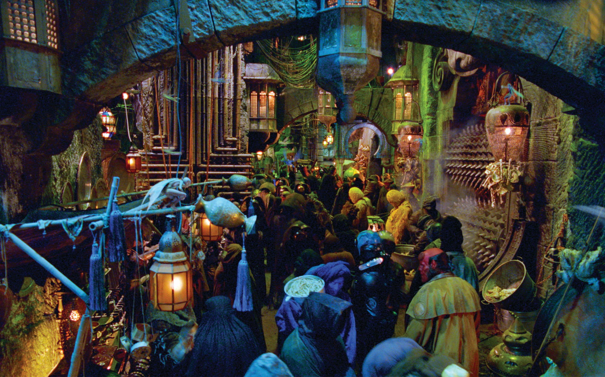 A Hungarian mine cave housed the gigantic Troll Market set, one of the biggest built for Hellboy II — a vibrant, busy environment filled with practical and digital creatures — which Del Toro wanted to deviate from usual design standards. “Each artist was free to bring forth as many sketches of creatures as they wanted,” Del Toro explained. “The only condition was to veer away from ‘movie monsters’ and make the creatures more surreal and exotic, reference things other than film: engravings from the middle ages, Hieronymus Bosch, the arabian tales, etc, etc. Barlowe had the best batting average… 8 out of 10 of his designs made it to the screen. But we treated these creatures like extras. We seldom, if ever showcased them — I felt this was crucial to treat the market like you would any other location… to make it real.”