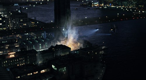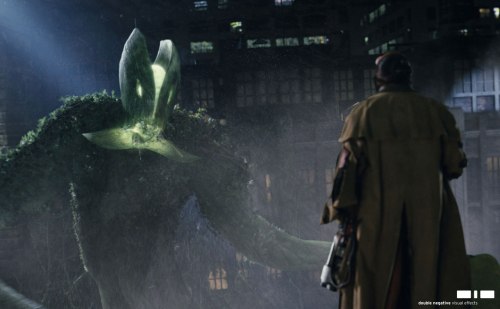 As the Elemental dies, its head splits open into a gigantic orchid-like flower, which releases clouds of pollen into the air. Photoshop concepts were produced by Deak Ferrand at Hatch FX, and the final effect of a small forest was a combination of an actual set extended with digital effects. Visual effects supervisor Mike Wassel said: “the ground level was built as a practical set that the actors could walk on and interact with. We transition into CG as the creature’s body extends up along the destroyed building; and then the aftermath scene was photographed practically, with little or no CG enhancement.”