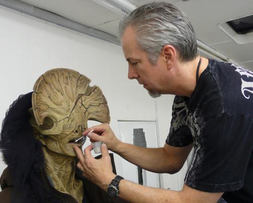 Once finalized, the Angel design was translated to full size. Cabrera sculpted the body portions that would be applied on the performer — such as facial appliances, gloves, and a chest piece — on a life cast of Doug Jones. The make-up was applied by Thom Floutz. Similarly to Abe Sapien, the Angel make-up involved a vacuform piece that flattened the performer’s nose. The fiberglass headpiece blended in with the foam latex make-up covering Jones’ mouth and lips. Dentures with teeth slightly jutting out completed the appearance of the Angel’s face; Jones could only see through two imperceptible, sculpturally-hidden slits in the headpiece.