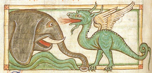 Detail of a miniature of an elephant and a dragon from a bestiary, England, cca 1236-1250.