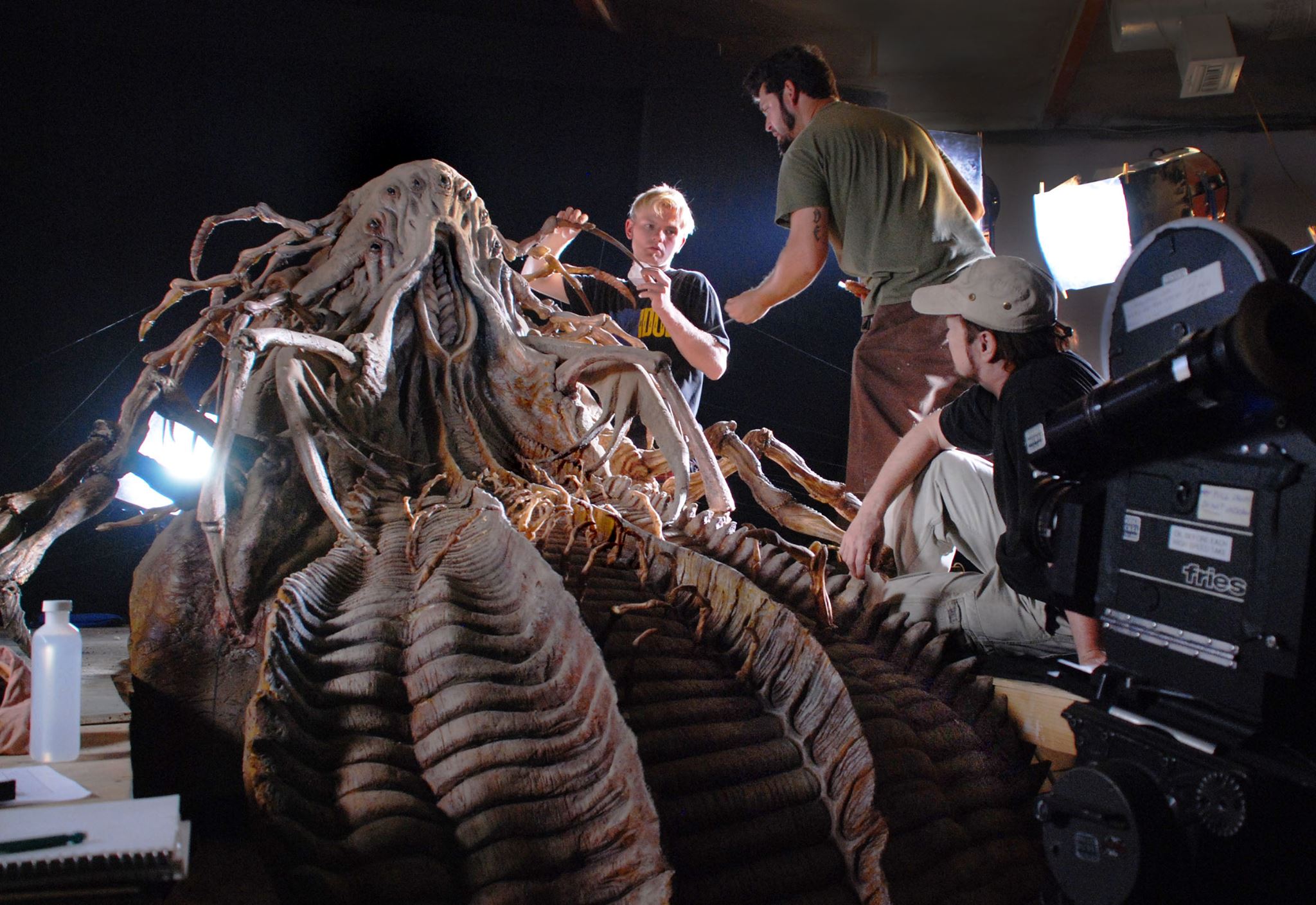 The large creature was called the Behemocotyl and it was roughly the size of the Jabba the Hutt creature. It was a huge puppet and took months to build, mold, paint and rig. It took a half a dozen puppeteers to give it life — including myself! We created the puppet and shot those scenes at SOTA Effects, a creature effects company that at the time was directly across the street from the Van Nuys airport — on the same street as Stan Winston studios, Apogee and the original ILM studio. Took weeks to shoot. We were all pretty tired when it was done because it was extremely hot on the stages when we shot.