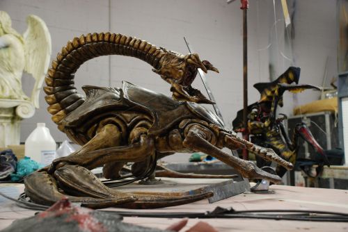 The returning bugs were the Arachnid warrior and the Brain Bug. Most of the arachnid warriors and the Marauder suits were CGI and animated by Roger Nall at 11/11 filmworks (supervised by Robert Skotak) but there were a few shots where we needed a rod puppet. One shot involved setting it on fire! So we built an arachnid warrior rod puppet sculpted by Jordu Schell, a very famous effects creature fabricator who has worked on many great creature films and we rigged it as a rod puppet and photographed it against greenscreen on our sound stage.