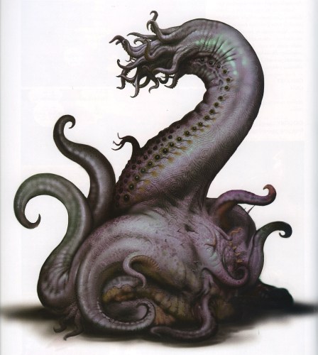 Collaborating with Del Toro, Mignola settled on an aesthetic deviation from the serpentine design, instead highlighting the gods’ lovecraftian origin. Wayne Barlowe related: “they were to be the purest incarnation of the Cthulhu ideal, redolent of the Old Ones’ age and otherwordliness.” He produced a single concept design for the Ogdru Jahad, and several illustrations of the gods imprisoned in their crystal prisons.